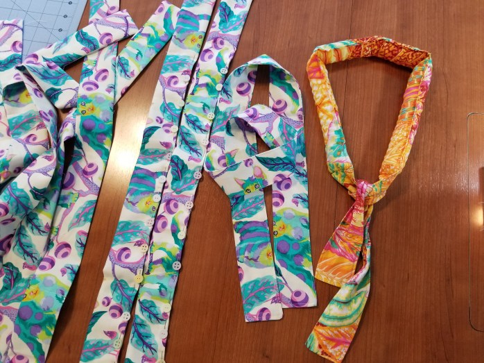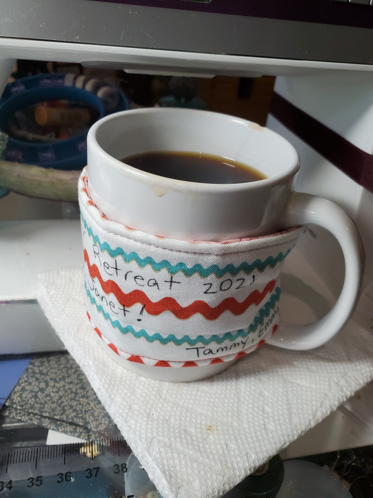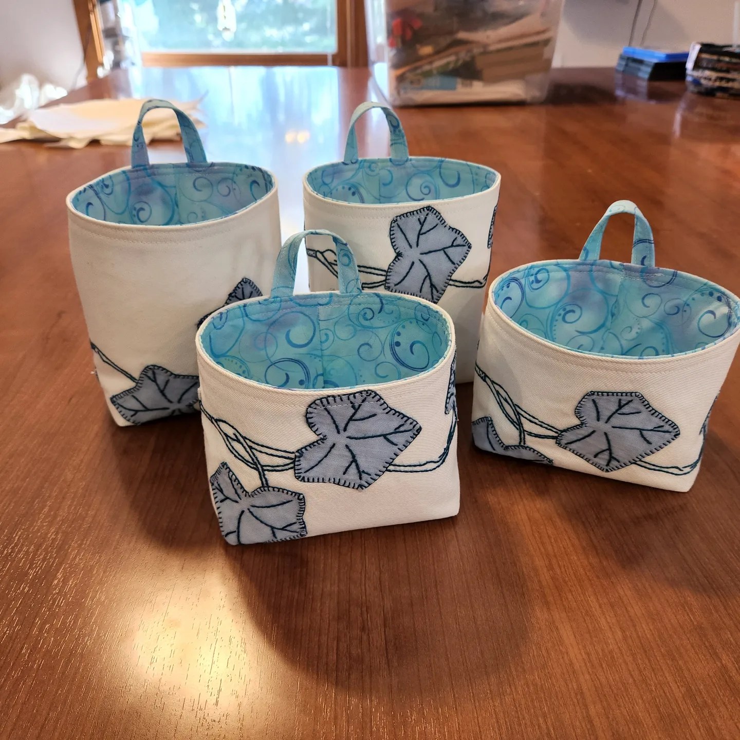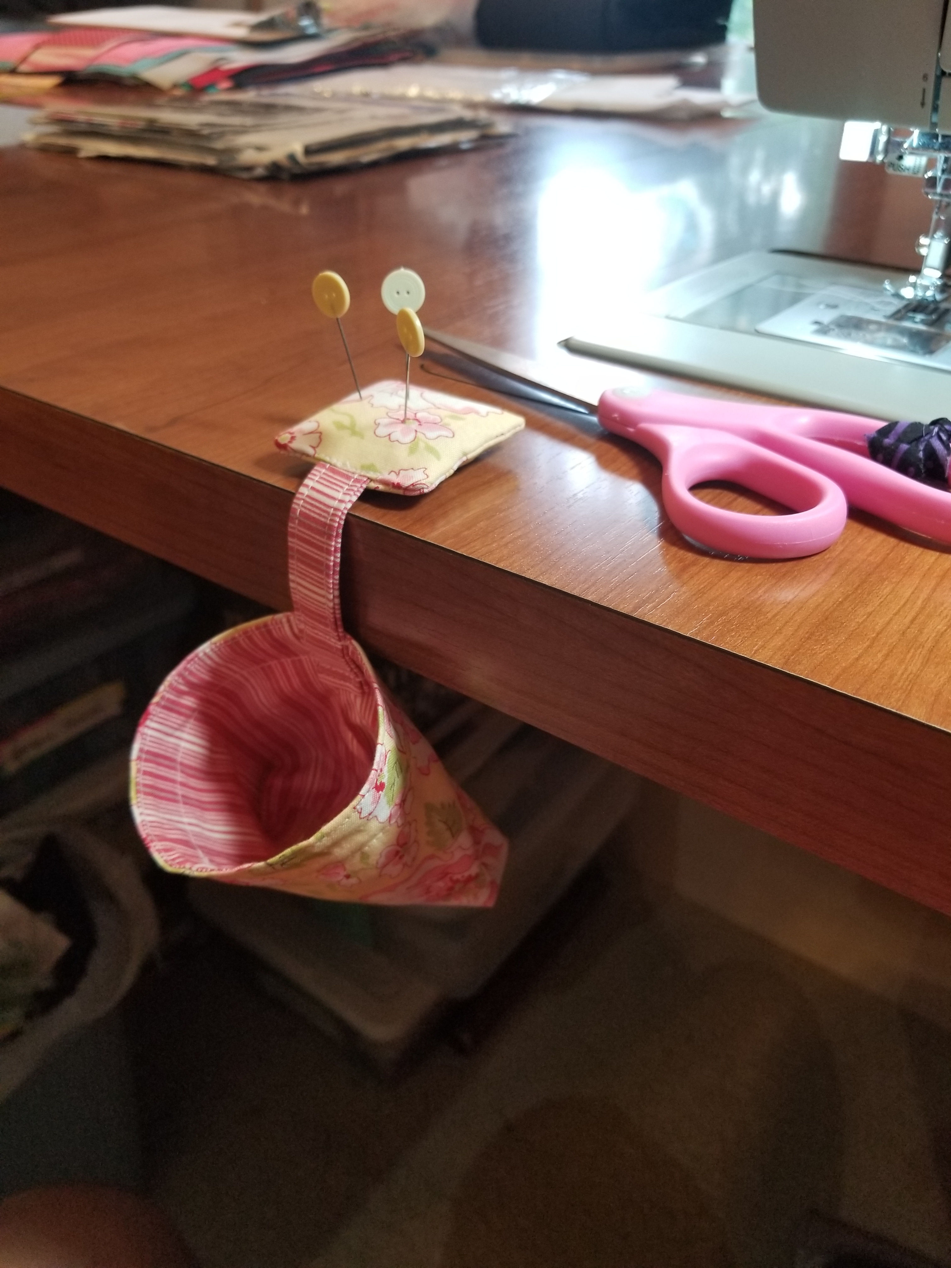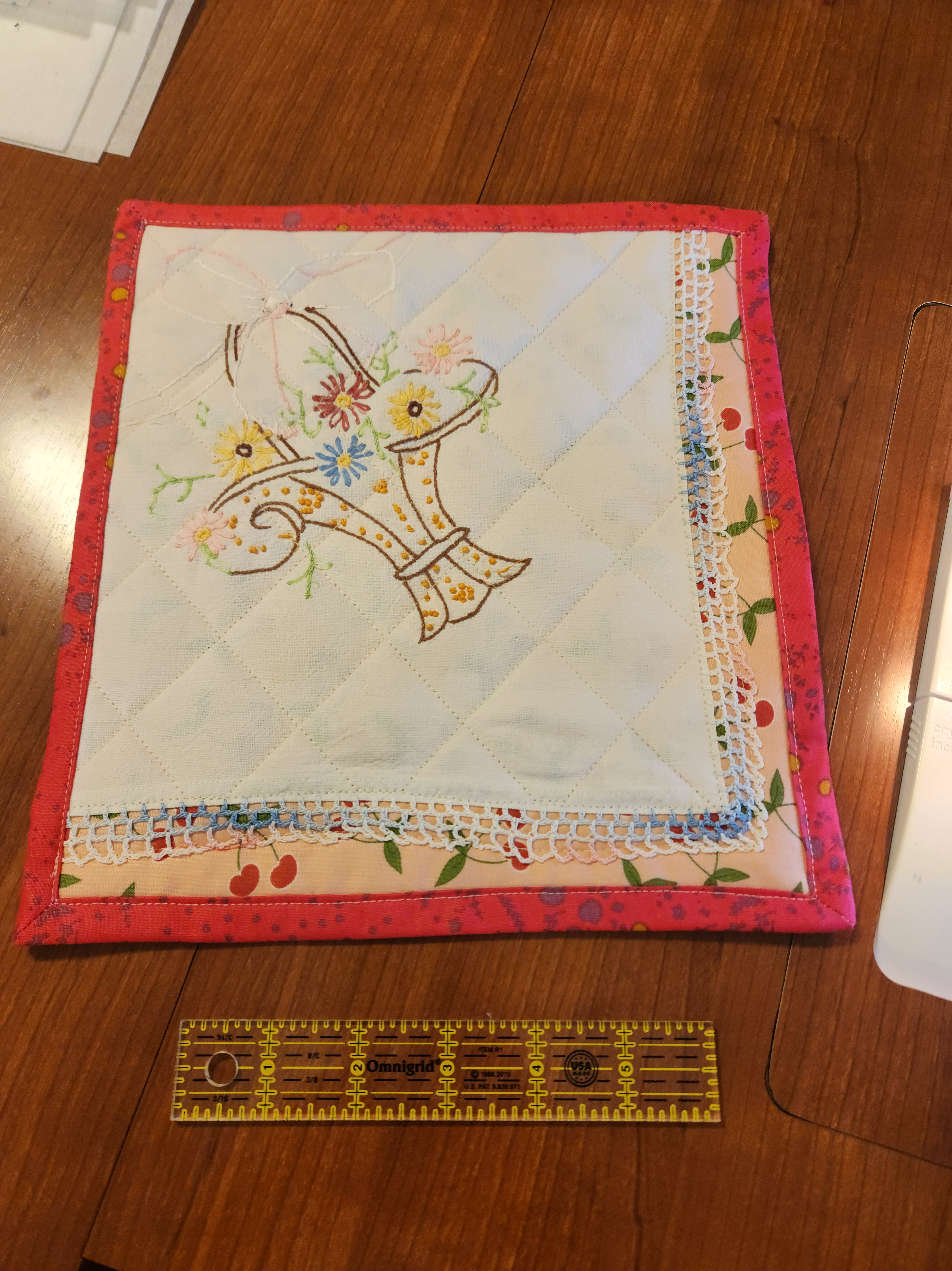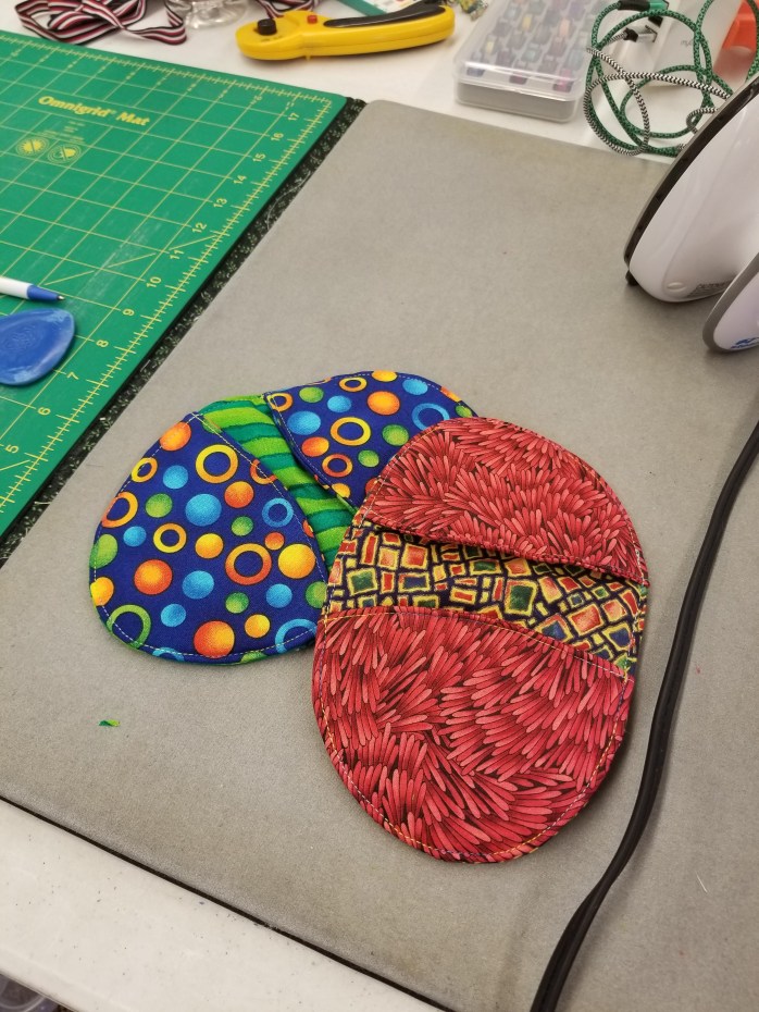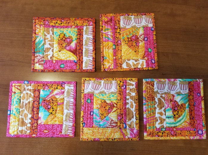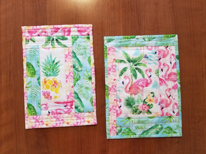I was practicing a new technique (well, new to me) to attach binding to a quilt or project of any size. Since it’s easiest to practice on something small, I made these. This technique uses the backing fabric to wrap around to the front and make mitered corners so it finishes nice and tidy.
