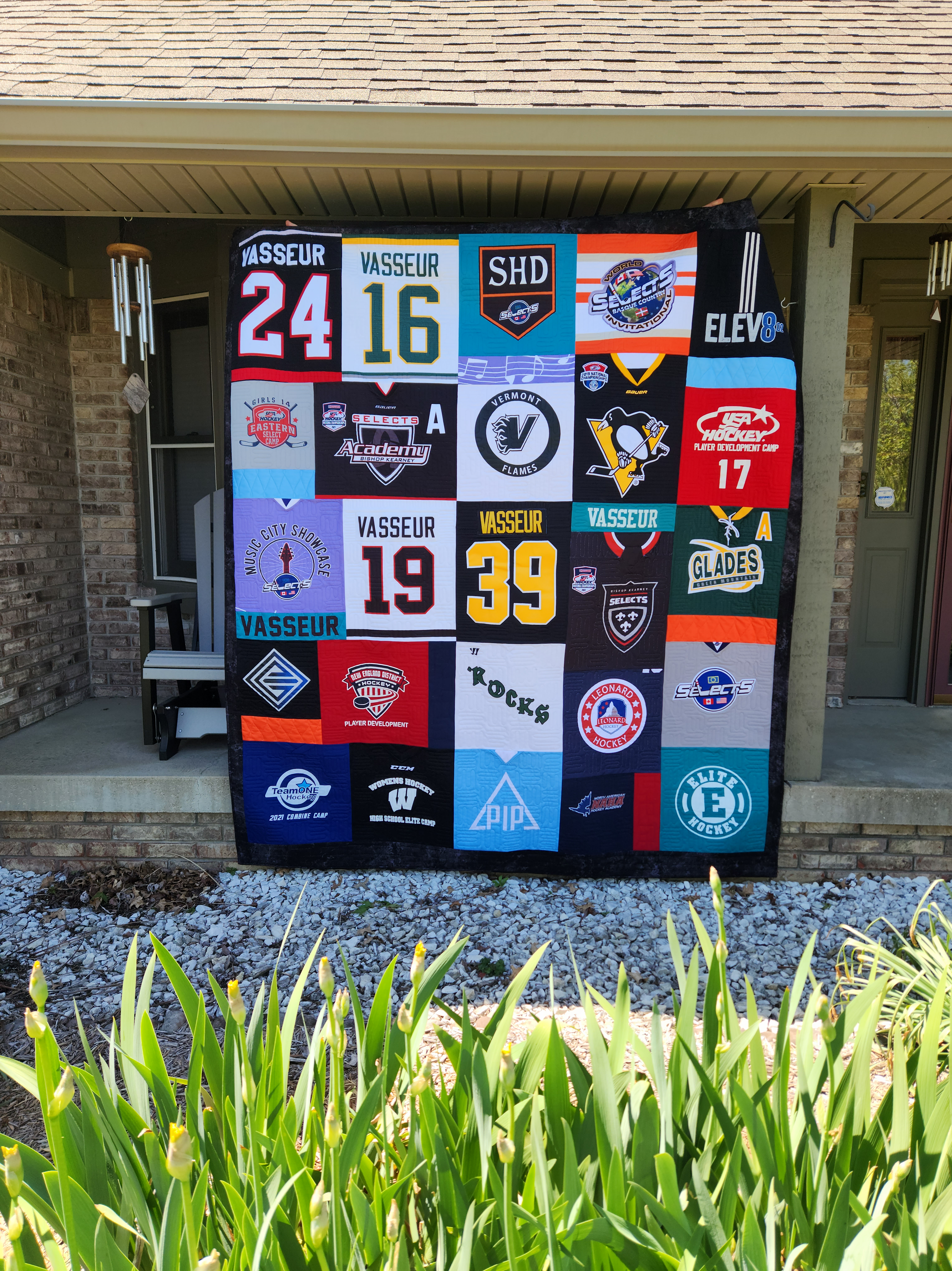 What an amazing t-shirt quilt. So many memories in these shirts and sports jerseys.