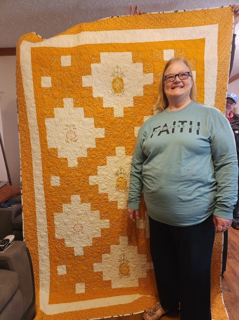 Merry Christmas to my sister-in-law! This quilt top was made by her mother and given to me for Christmas in 1997. Well, time does fly, doesn’t it. I pulled it out and finished it and gave it to my SIL for Christmas 2024. It’s a really beautiful quilt. My MIL hand stenciled the pineapples.