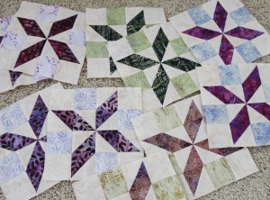 Saturday was a “Sew Day” with my sister, Janet, and my best friend, Shelley. The goal was to work on some quilt blocks for an exchange at the Indiana State Quilt Guild winter retreat. Each winter retreat the “back row ladies” (a group of wild and crazy gals) organizes some kind of quilt block exchange. At the 2011 winter retreat they choose to make these star blocks in batik fabrics which we will exchange at the 2012 retreat. This sounded great, but I didn’t have any batik fabrics – I know that must be difficult to imagine, so I spent all summer collecting fabrics. Then in the fall once sailing season was done I’d have plenty of time to whip up these blocks. Well, here it is just three weeks away from the retreat and I don’t have them done! A good way to get some focused quilting done is with friends! Janet already had hers done (the little project finisher that she is), but Shelley and I really needed some help. Shelley is using a method to sew triangles called Thangles and I used a method of sewing squares together then cutting them apart to make the triangles. Both methods turned out beautiful blocks! Here are some pictures of my blocks: