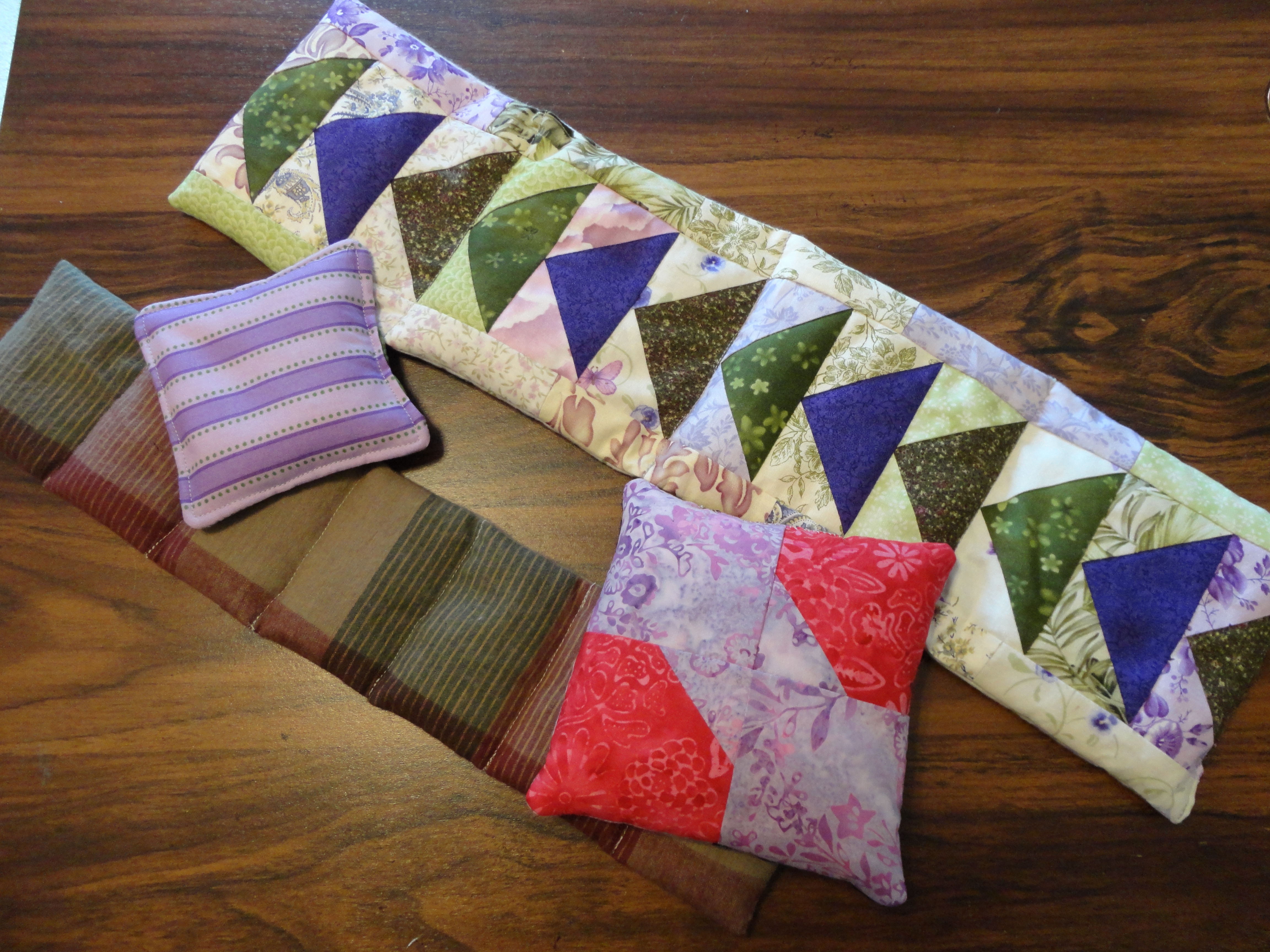 Oh, what a wonderful project this is. These little bags are easily constructed and then filled with regular rice. Heated in the microwave for just a minute or two then placed where needed to provide comfort. Use as you would a regular heating pad but without the hassle of a cord. And the longer ones can be wrapped around a knee or ankle and give warmth to the entire joint. A couple of these are backed in cozy flannel to provide a soft fabric next to your skin. Plus, if you keep one in the freezer you can also use it as an ice pack. How cool is that?!