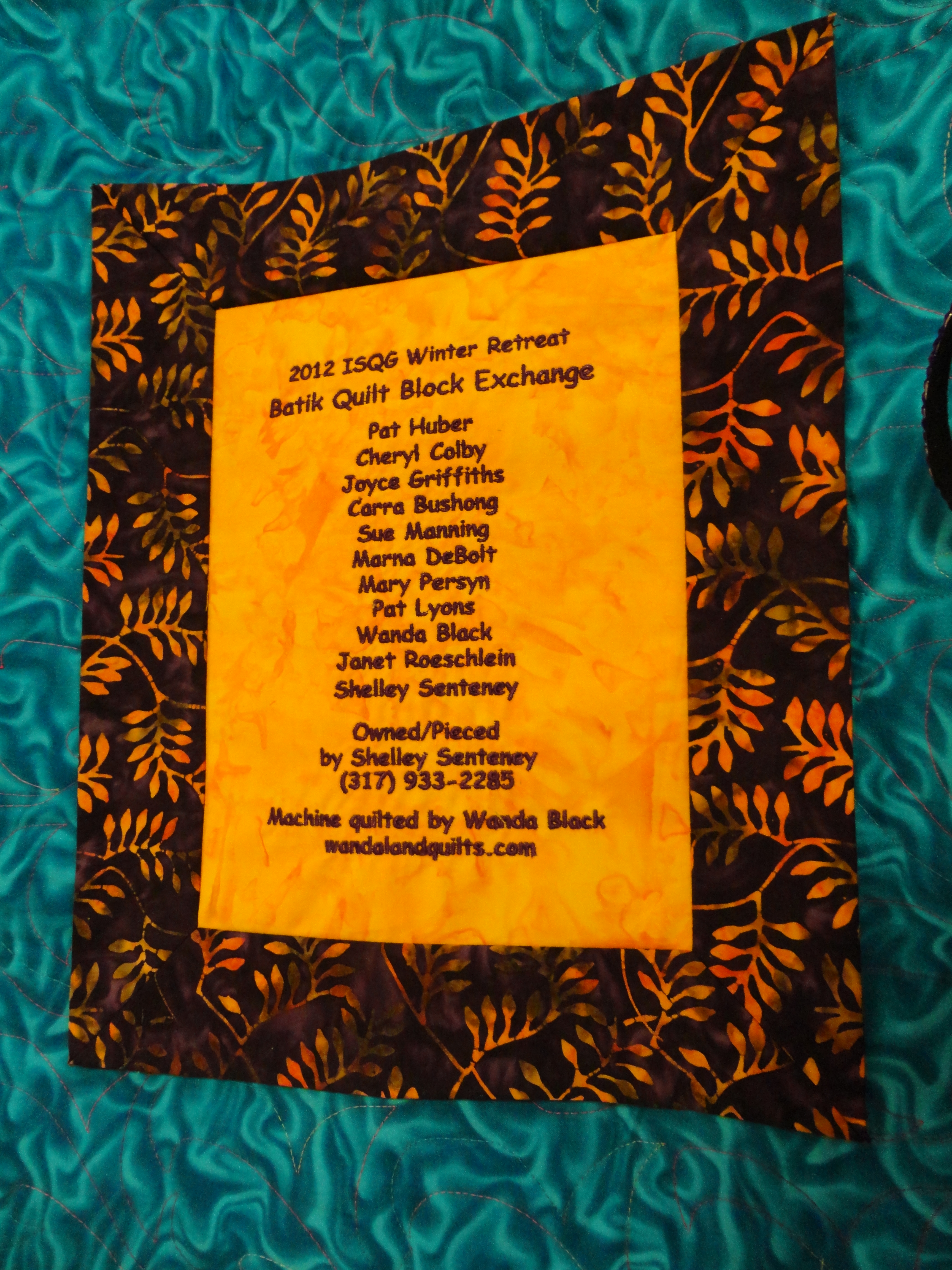 My dear friend, Shelley, made this beautiful batik quilt as part of a block exchange with some gals from the Indiana State Quilt Guild. I was thrilled when she asked me to quilt it for her. She requested the Double Wave quilt pattern with a variegated thread. Both of those turned out to be the correct choice!