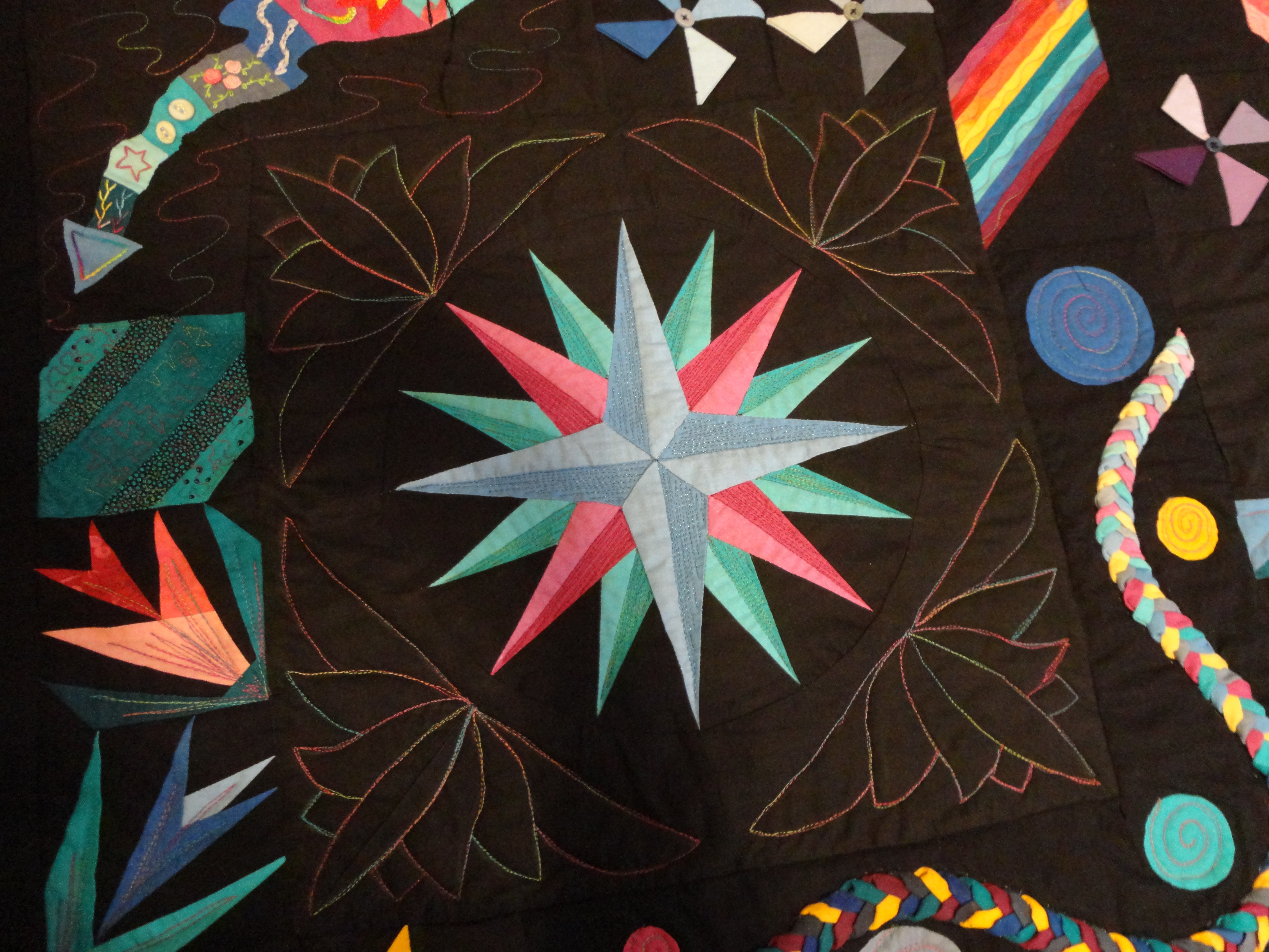 I had so much fun quilting this! I hope you can click on the picture and get a close up look at the blocks as well as the quilting (only to brag a little). I just love the design around and in the center star, the 3D braid, and the fish bubbles.