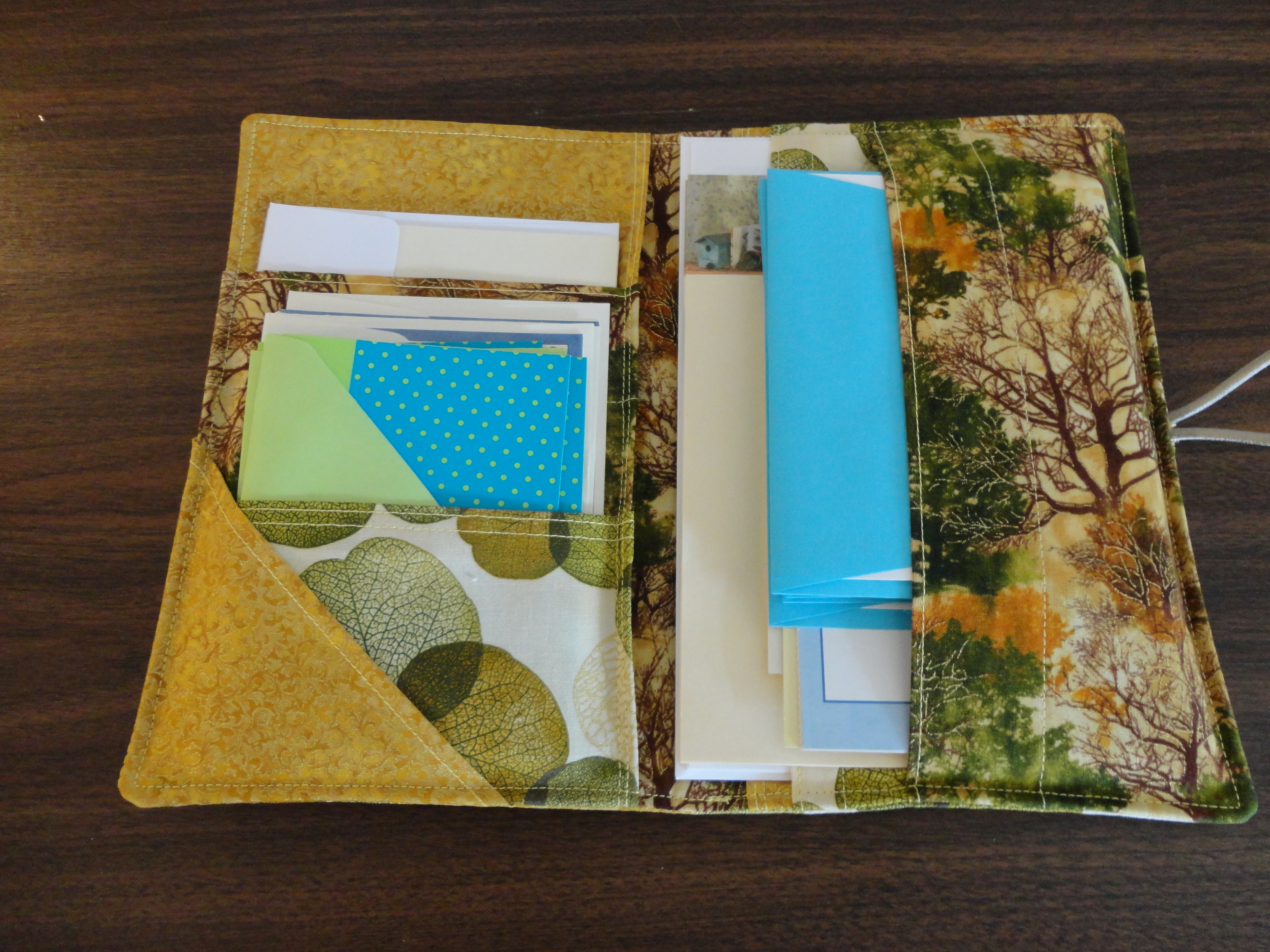 Here is a Stationery Holder. I found a lot of pictures online but no real directions so I created my own! This is just the right size to carry in a purse (if you are like me and have a large purse) or a briefcase. How many times have you said, “Gee, I should write so-and-so a note.” but didn’t have any stationery or cards handy, then by the time you got home you’d forgotten all about it. Well, not now! This way all the supplies – including stamps and a place to store addresses – will always be handy.