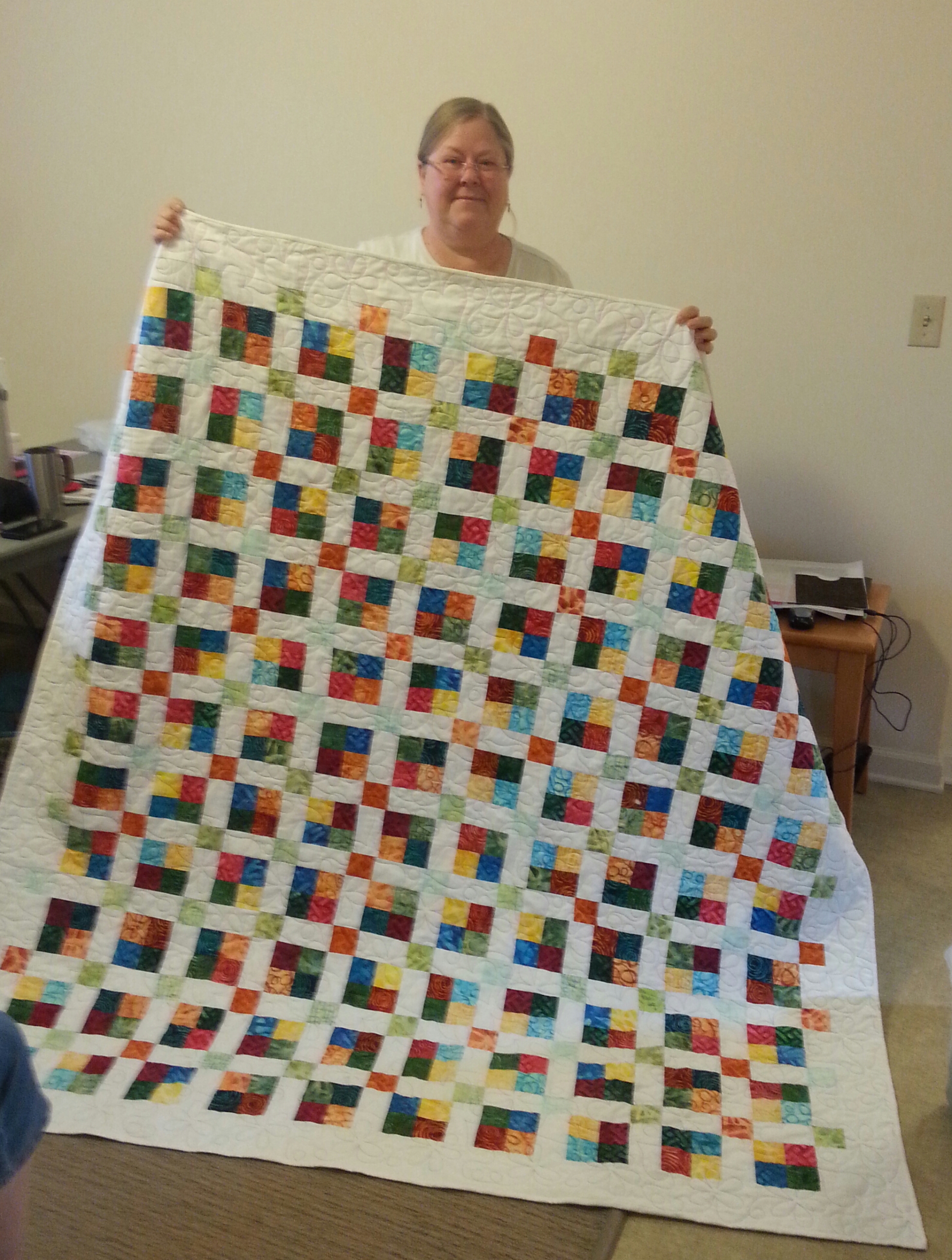 This next quilt is one I quilted for my sister, Janet. This was made from batik fabrics and is just stunning! Starting with a jelly roll of fabric and adding a bright white really makes these colors pop! She gave this to her long time friend – what a special gift that is.