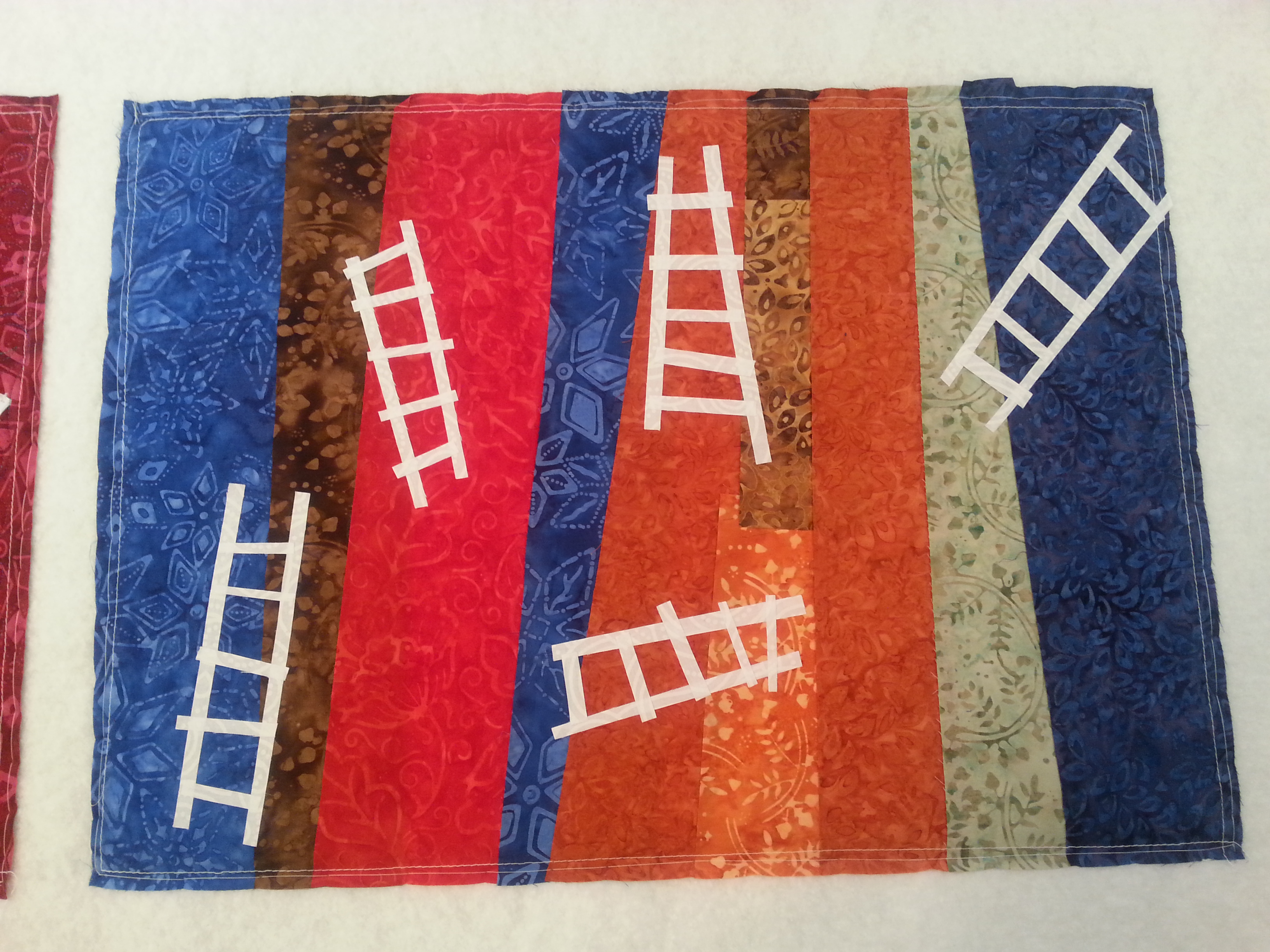 Once again I’m trying my hand at Art Quilts. They are the size of placemats. The ladders represent challenges in life, they can take you in different directions, some are easier to climb than others. Not sure that comes across clearly, so some day I’ll try it again. I probably won’t use them as placemats but maybe on a dresser or table top.