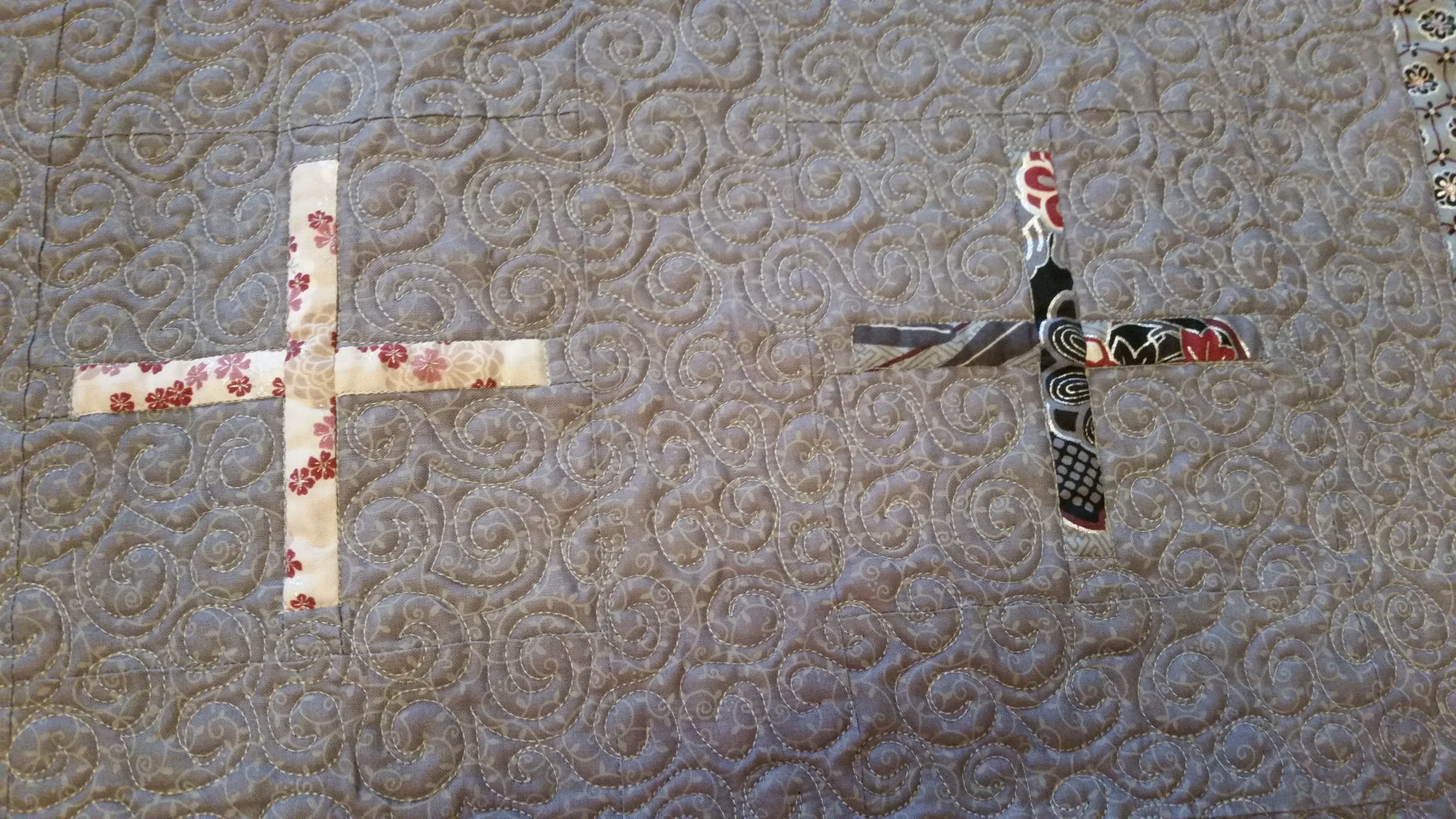 The machine quilting is what I was looking forward to the most. I wanted to practice my longarm quilting and this was the perfect piece. I did stitch in the ditch (SID) around the plus signs using a ruler and that went pretty well. SID quilting can be tricky and takes some concentration. The background around the plus signs is a swirl pattern. I was practicing keeping the spacing even and not getting stuck in any of the corners – trust me … there were a lot of corners! The first border, I used a plastic template to trace a border design, so I just quilted on the line. Sounds easy enough, but still takes practice and concentration. The outside border is my own design. This was practicing several things, backtracking, spacing, stitch in the ditch, and making the design while stitching in all directions.