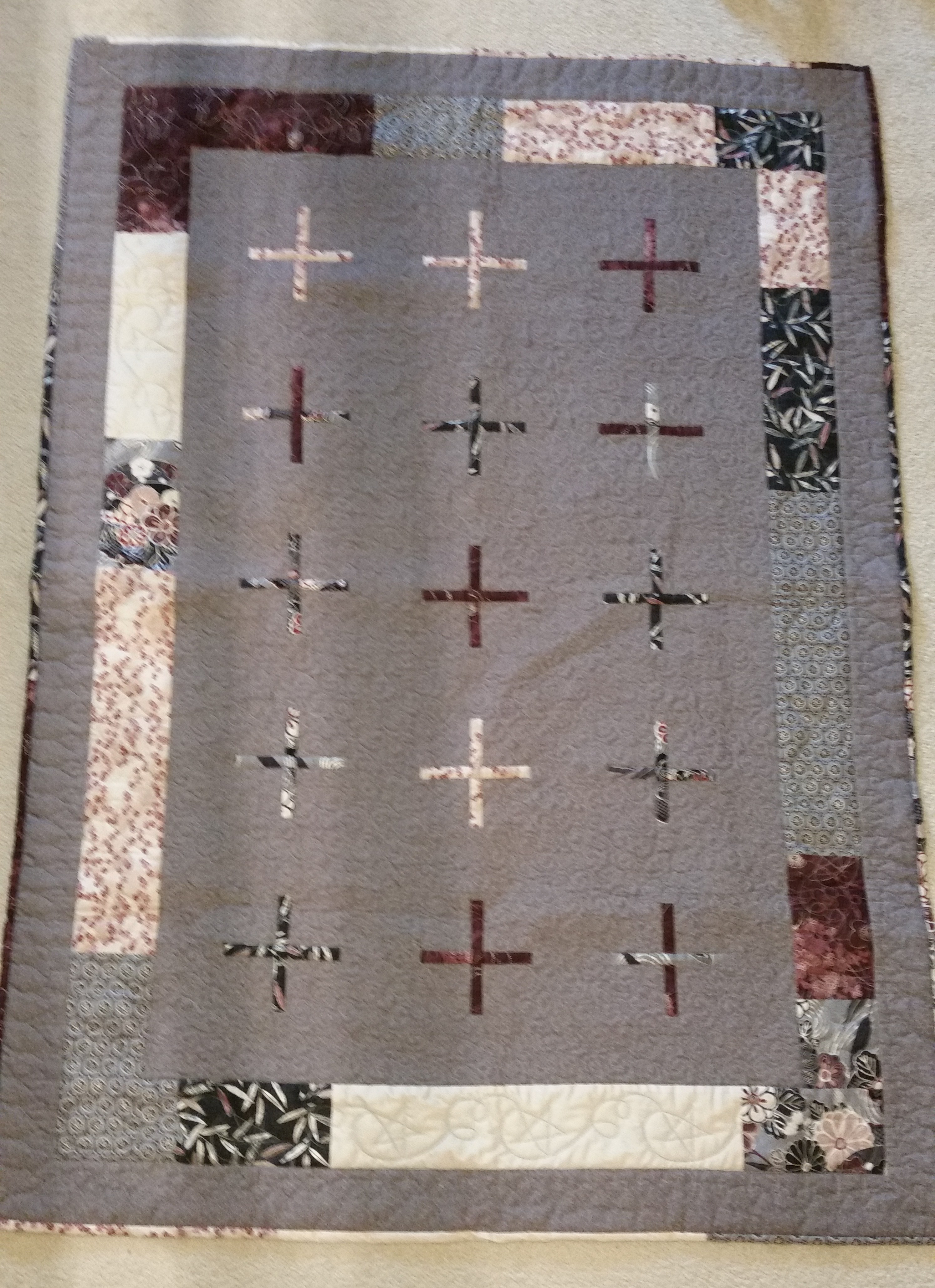 I had this collection of delightful Oriental fabrics to make the blocks from. I pulled the gray background from my stash. I believe it was leftover from another quilt, but who really knows? I seem to have a lot of leftovers from other quilts so I’m trying to use those up. So, creating the blocks and sewing them together was pretty easy and made a delightful lap size quilt.