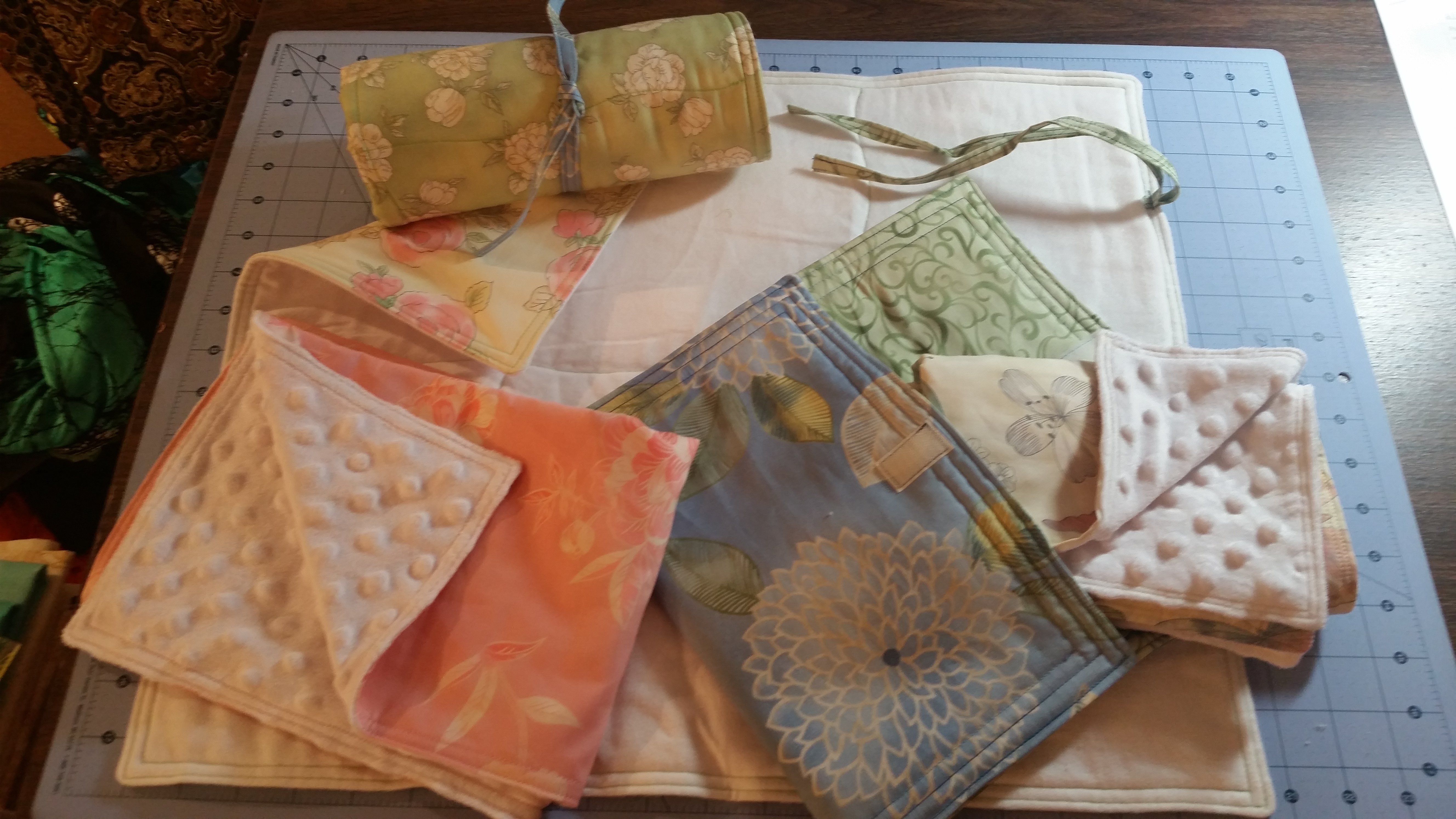 One of my co-workers is expecting twin girls in a few short weeks, so naturally I had to make some baby gifts. The picture below is two small blankets (with the bumpy fleece fabric), two changing pads that are backed with flannel (one is laid out flat and the other is rolled up – makes for easy outtings) and the ties can easily be removed and used as a larger baby blanket, and a pouch to hold a package of baby wipes and a couple diapers. These were so much fun to make and worked up quickly.