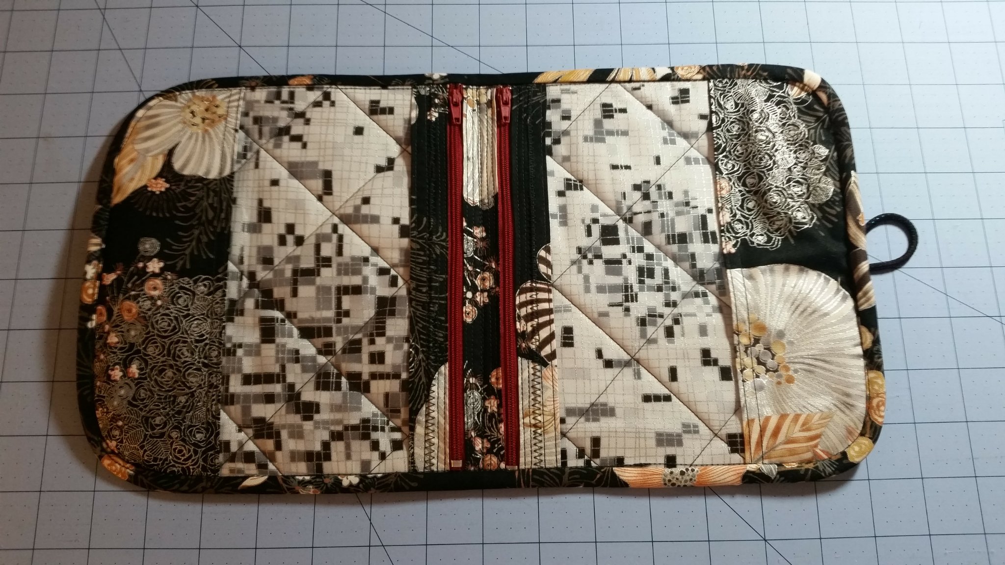 I’d like to share a wonderful little project I made – it’s a travel sewing kit. There are two zippered pockets inside to hold plenty of supplies. I don’t have a picture of mine filled, but I keep the fabric portion of the project in the left pocket and the right side holds thread, scissors, a small needlebook, and whatever else I need. It’s so easy to take along on car trips or even on a plane. With the clear pockets it’s easy to open for airport security, too.