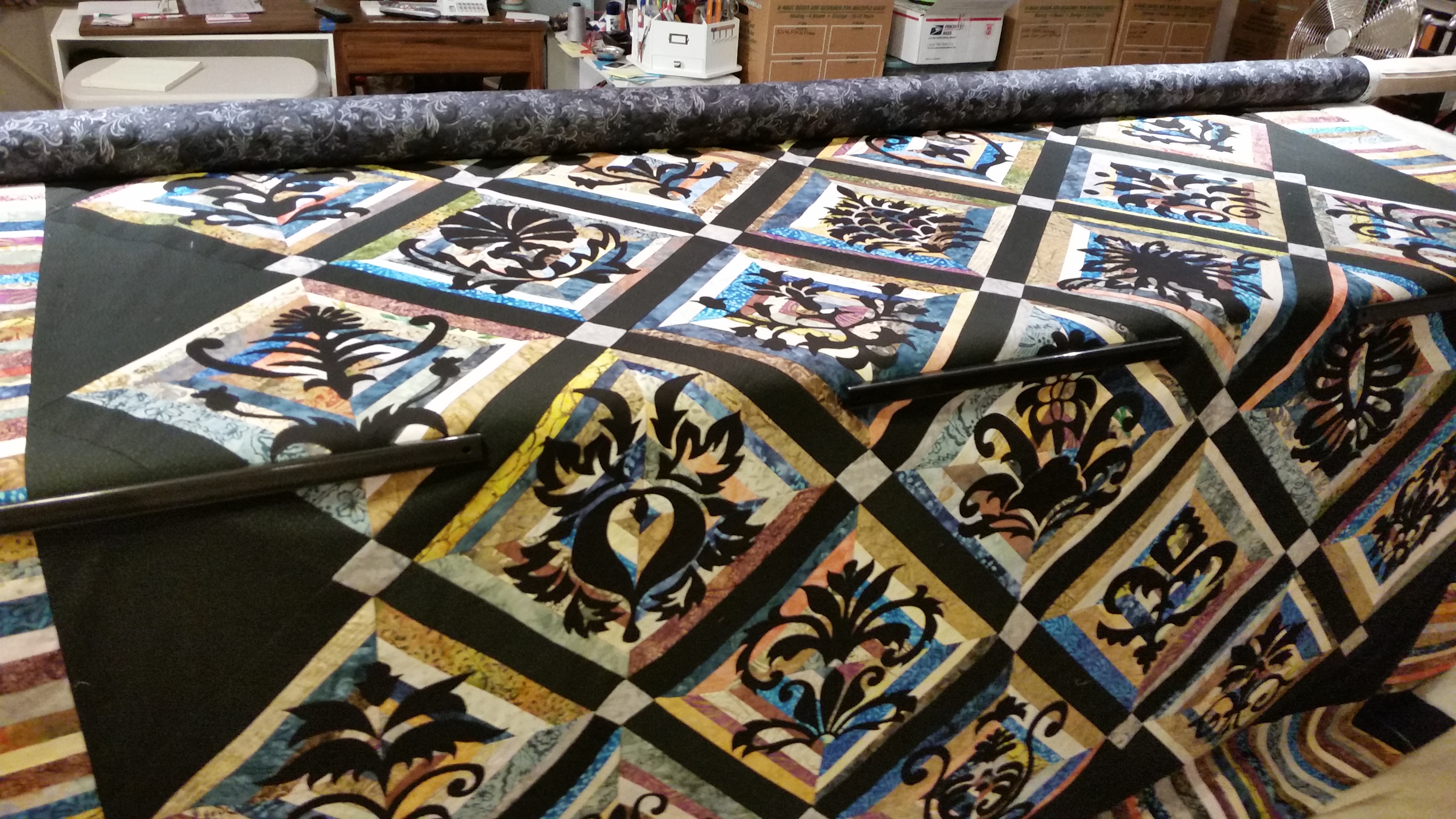 My dear friend, Shelley, made this quilt top for her son’s wedding and I had the privilege to quilt it for her. She did a great job of collecting batik fabrics and piecing them for each block background. Then using her super fancy cutting machine she cut out each black applique and fused it to the background block. Then she used a buttonhole stitch around each design. The black sashing set the blocks on point and the piano key border really set it beautifully. Well done!