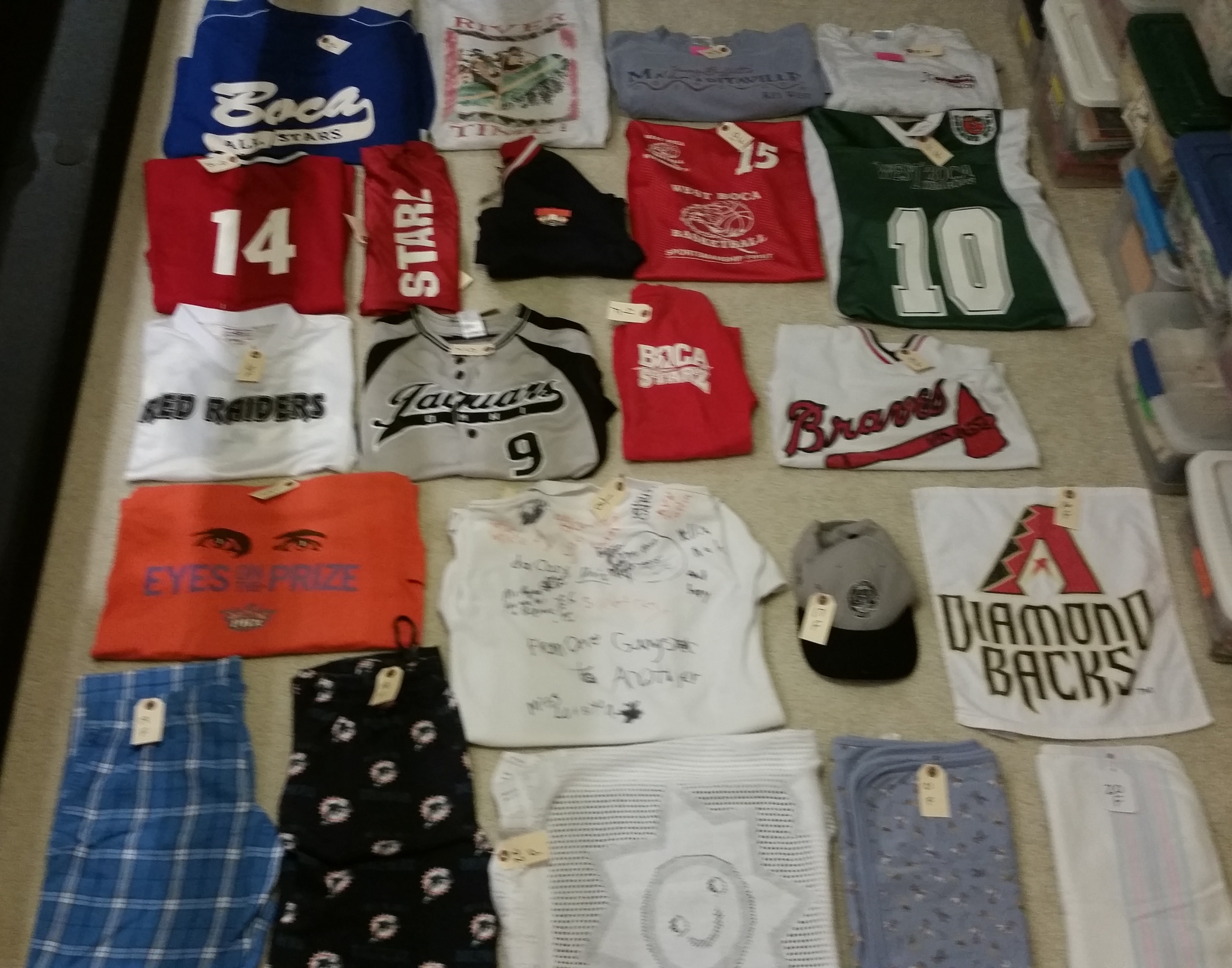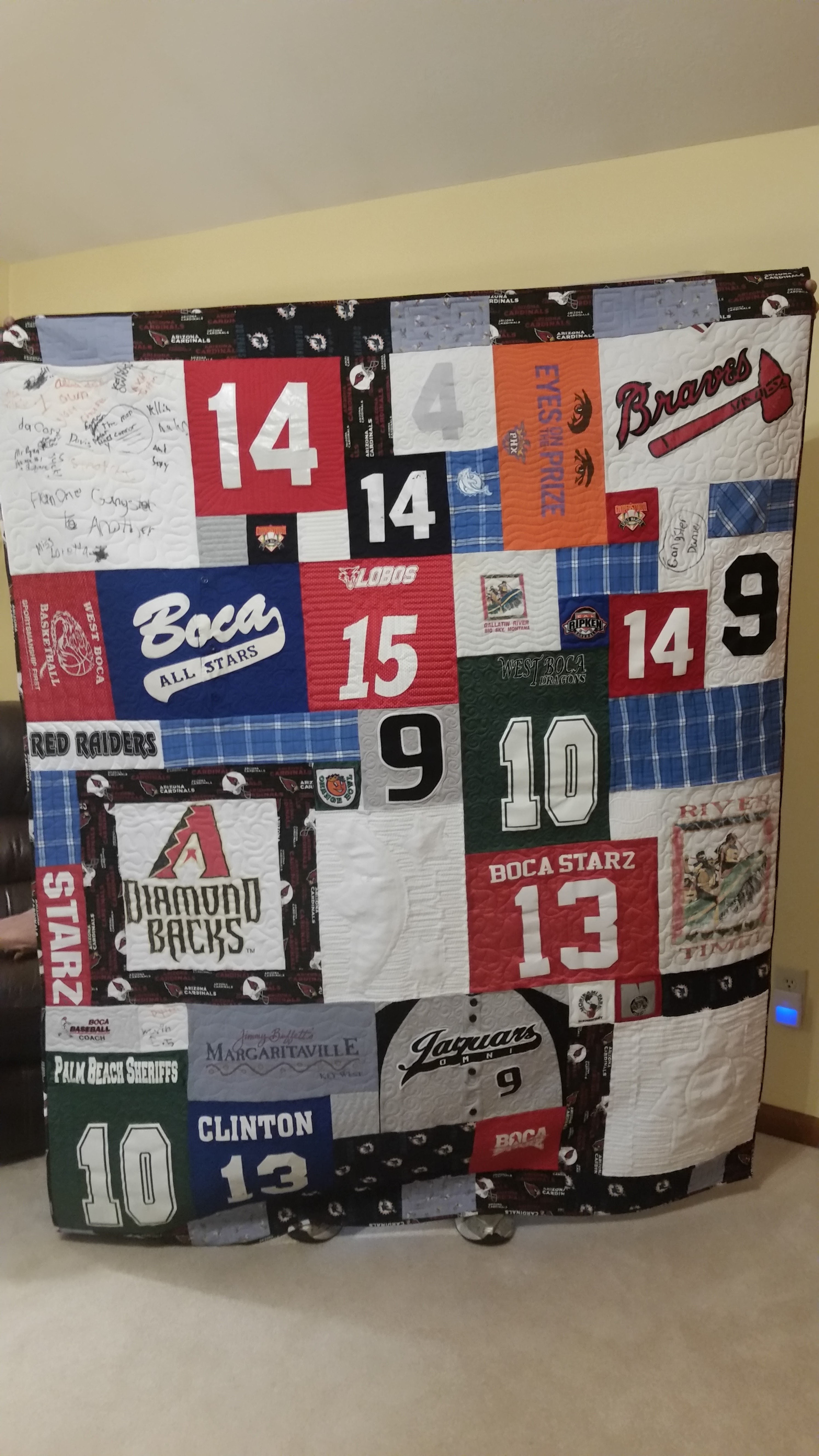 I was given a variety of t-shirts, sports jerseys, flannel pants, baby blankets, and even a baseball cap. All these items were used in the quilt and to make one special bonus item.