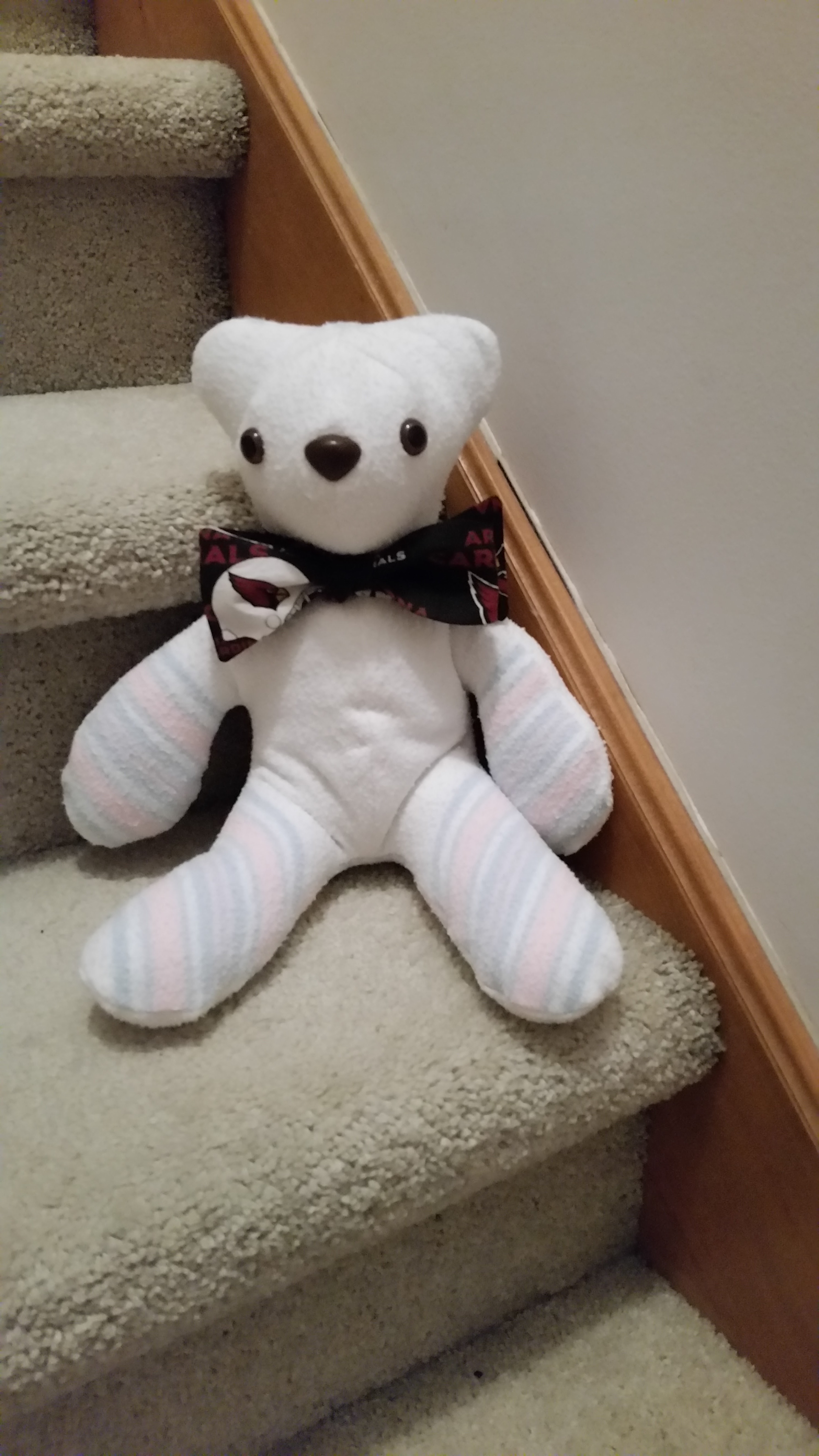 In the collection of clothing provided were a couple of baby blankets. Pieces of both of them were included in the quilt, but from the left over pieces of one of them, I made this teddy bear. Naturally, I also had to make a real bow tie for the little guy.