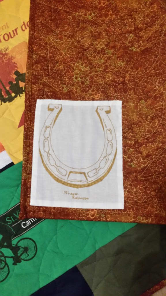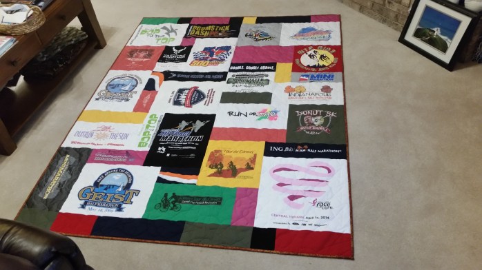 These t-shirts are from a runner in my home town so I recognized a lot of these shirts. In fact, I have some of them myself! It was a delight to see how nicely they worked up into a quilt. What a great memory she will have from participating in each of these events.