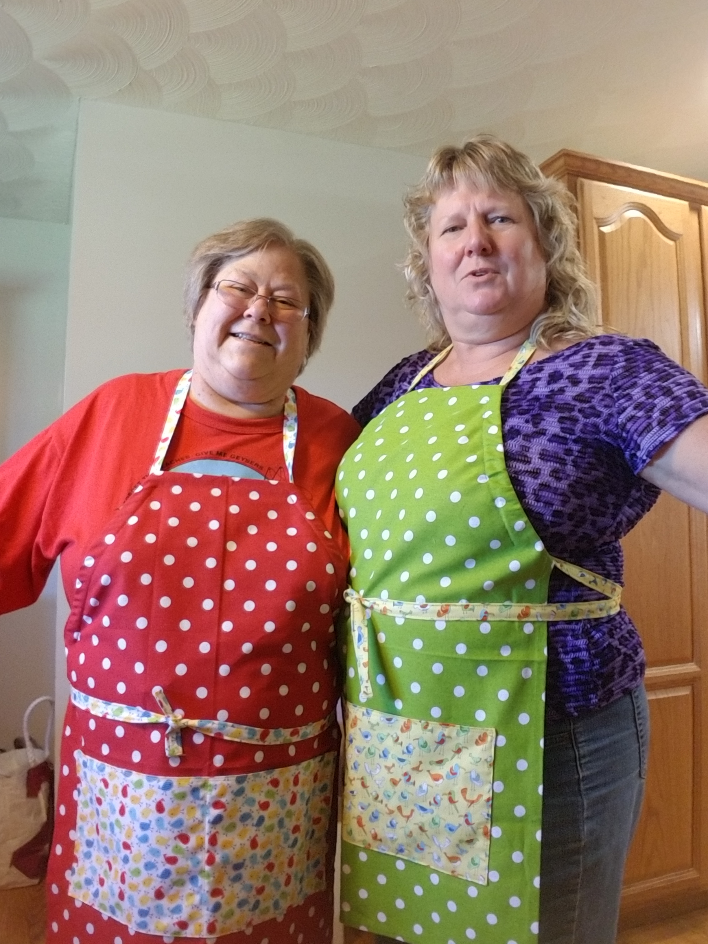 This is a picture of my sister, Janet (on the left), and I wearing our aprons. These are made from dish towels so they are super simple to make.