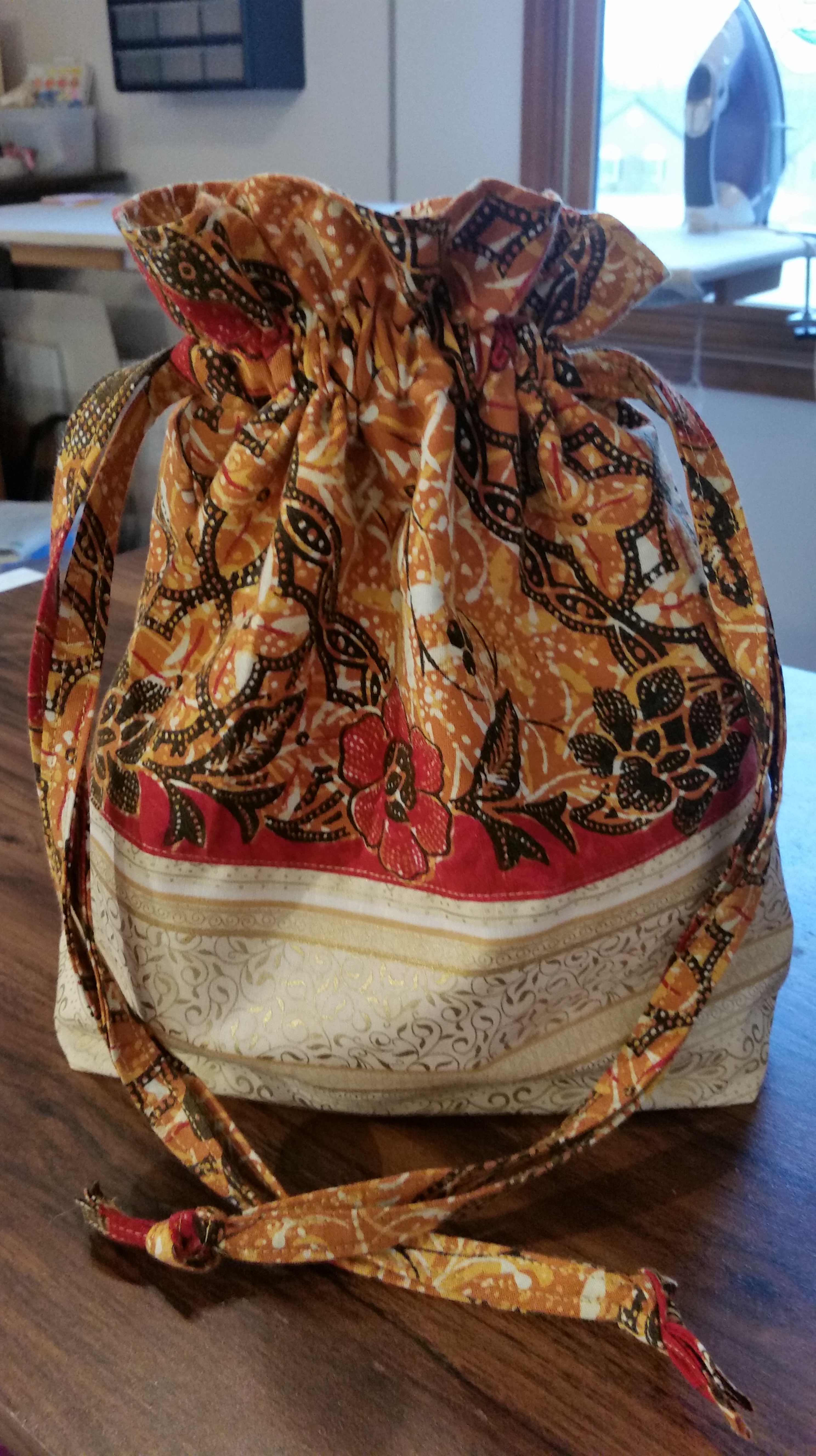 I have a difficult time throwing out even the smallest fabric scraps. I tend to toss them into some kind of container – in this case it’s a small wooden container. I believe I picked this up from Goodwill some time back and as a “scrap catcher” it works pretty well.