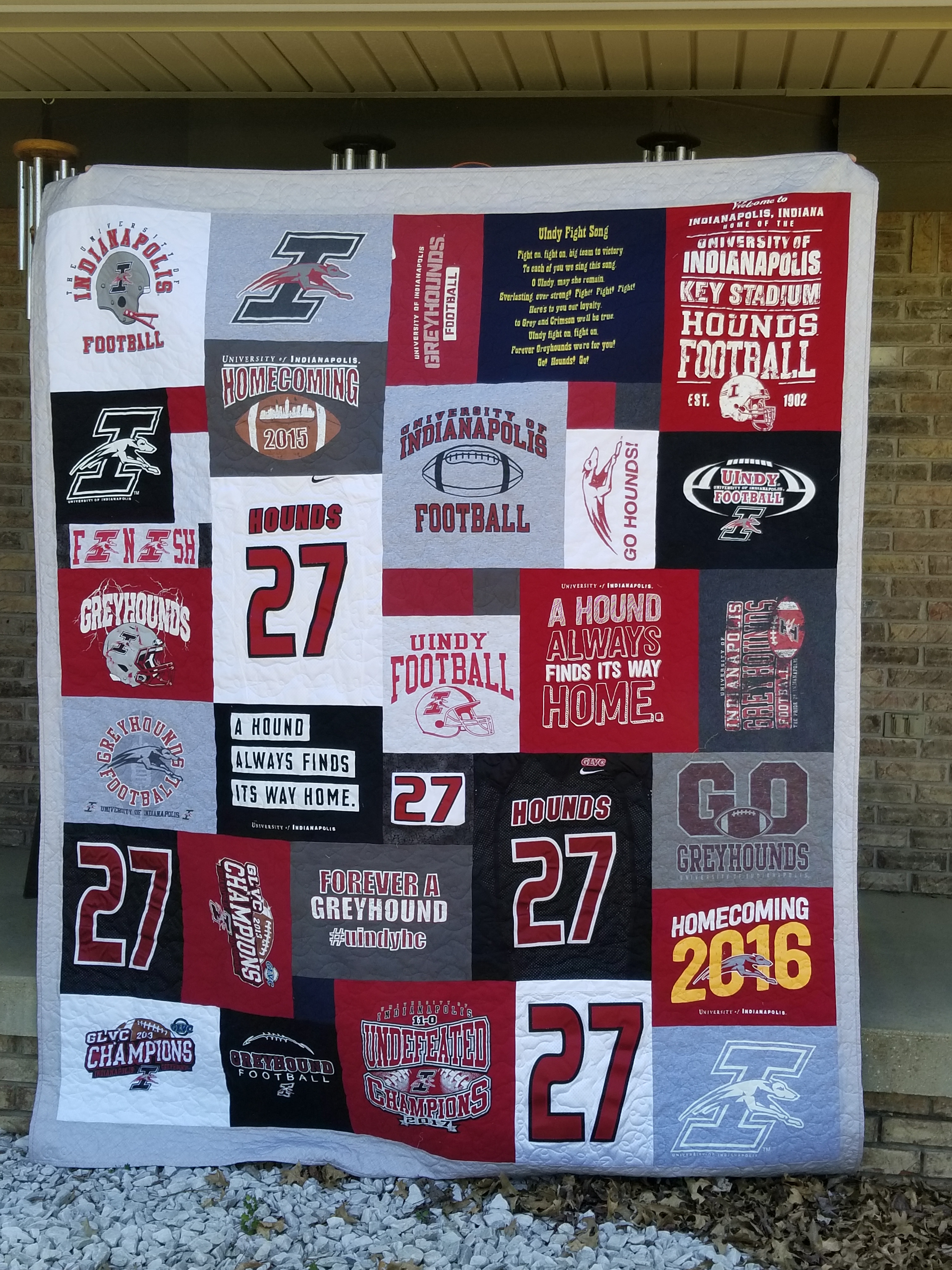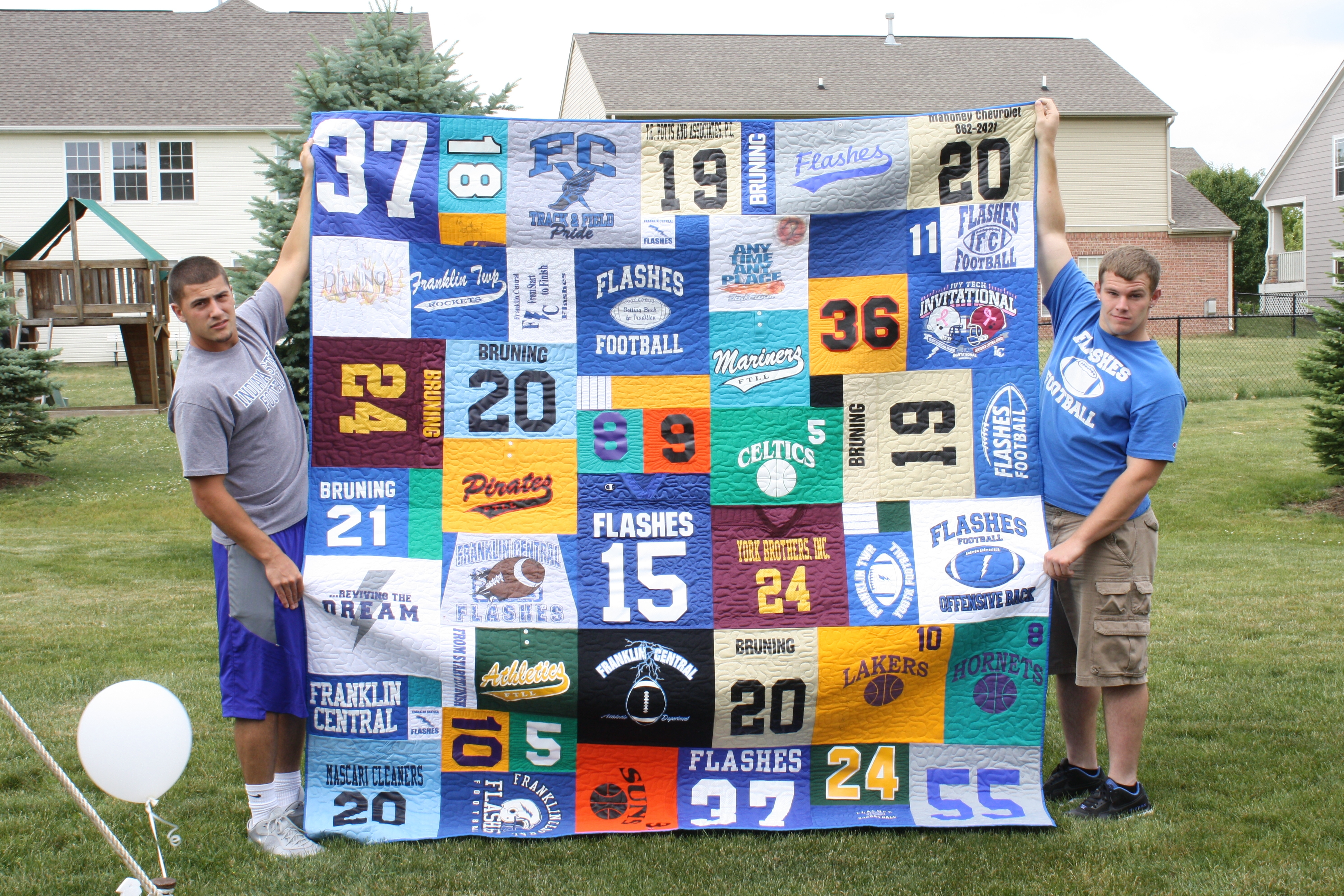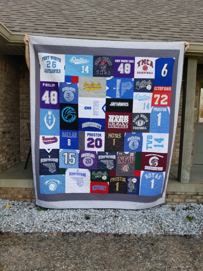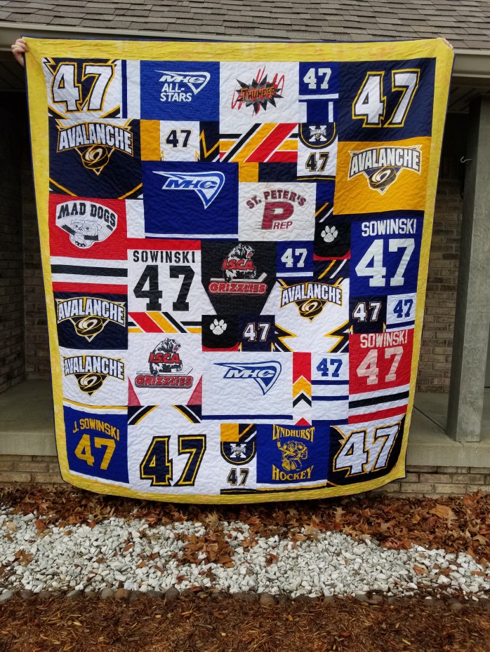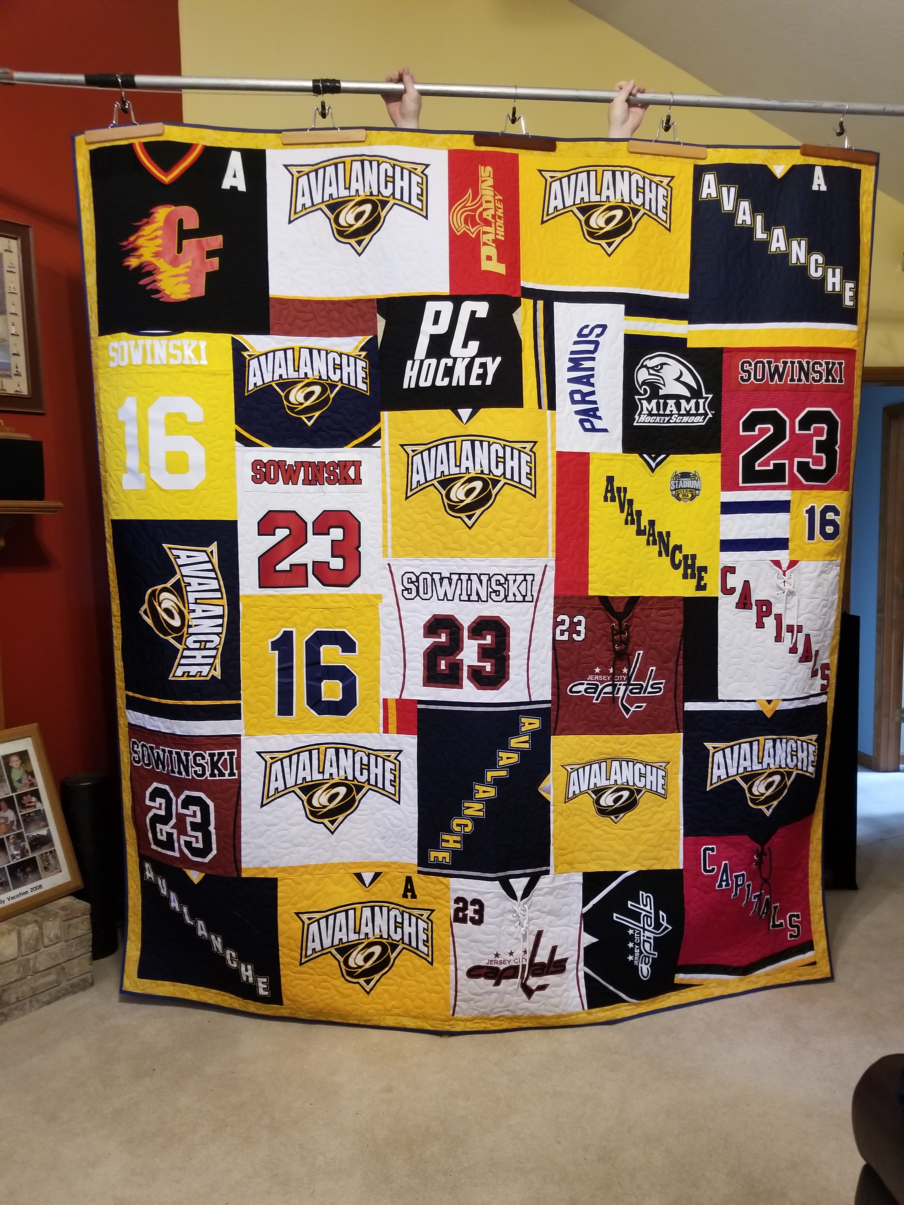 Hockey Jersey Quilt (close up) – I was able to keep the laces on some of the jerseys as well as do photo transfers (individual and team photos)