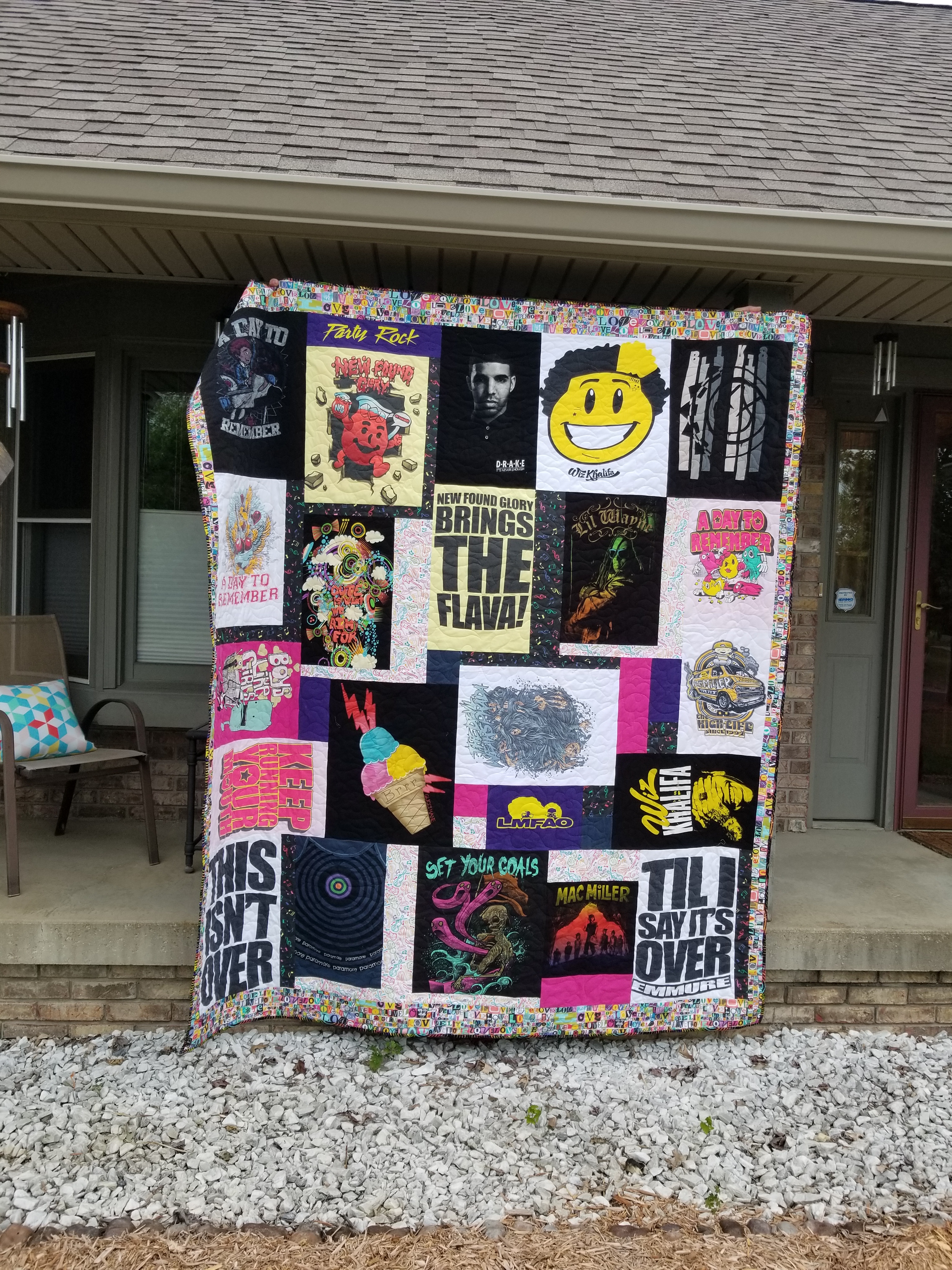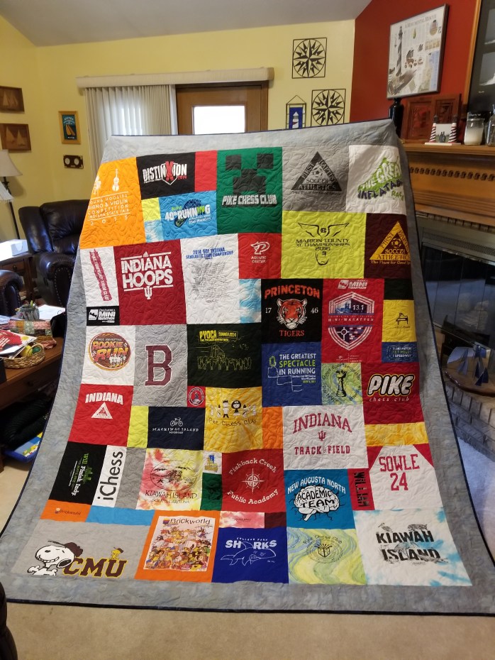 Clint with graduation quilt (numerical fabric since he is an engineer)